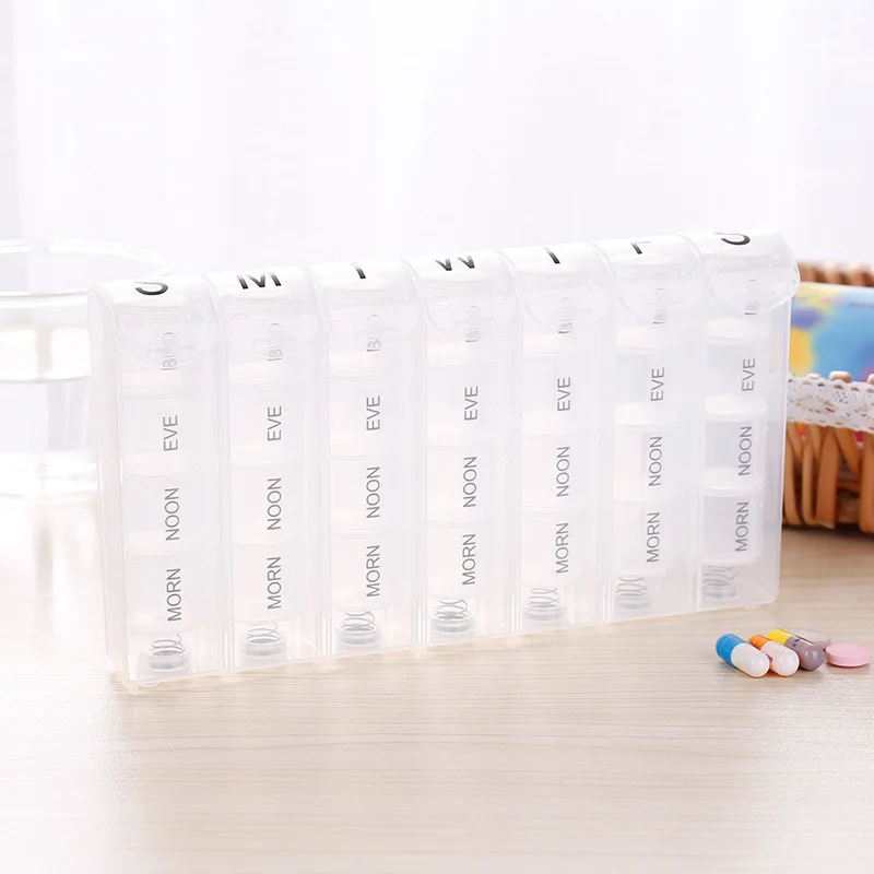•Store a Week's Worth of Meds. You can simply organize your weekly medication dispenser at the beginning of the week and place the organizer on the counter to easily keep track and maintain your am/pm medication regimen, which is great if you're traveling or on-the-go since you can detach exactly the days you need.(size of each compartment: